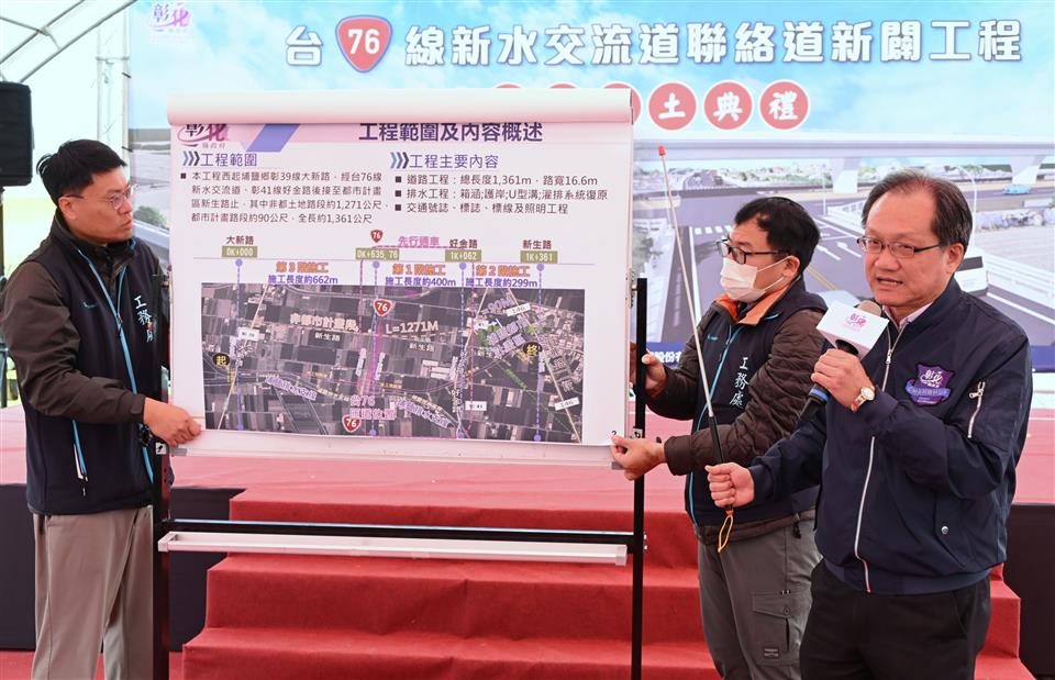 新聞焦點 中央地方攜手合作新典範 台76線新水交流道聯絡道新闢工程盛大開工 發布日期 2026/01/30~2026/02/28 | 發佈單位: 工務處 | 發佈日期: 林代理科長 7532093 | 更新日期 2026/01/30 | 瀏覽人數: 26人 配合東西向快速公路台76線(原漢寶草屯線)台19線以西路段延伸工程計畫,並因應埔鹽鄉發展帶來的交通需求,縣府積極向中央爭取經費,推動「台76線新水交流道聯絡道新闢工程」。今(30)日上午在台電埔鹽變電所前舉行開工動土典禮,彰化縣長王惠美、交通部政務次長陳彥伯等貴賓與會。總工程經費5億7,145萬9,000元(中央補助4億6,288萬2,000元,縣府自籌1億857萬7,000元),工期720日曆天,預計於117年2月底前完工。另外為配合台76延伸工程今(115)年底通車期程,本工程新水交流道匝道至好金路路段預計於今年10月先行完工開放通行。 王縣長表示,很高興迎來埔鹽地區的大建設,感謝交通部補助經費,以及議長謝典霖及與所有議員的支持,成功推動這條台76線新水交流道聯絡道新闢工程。埔鹽不僅是「蔬菜故鄉」,更是「糯米原鄉」,農產必須藉由便利的交通建設才能有效率地運輸到其他縣市。相信新水交流道完工後,配合聯外道路,未來對農產品產銷作業會有極大助益。 王縣長指出,本項工程西起彰39線大新路,往東行經台76線新水交流道匝道、彰41線好金路,終點到新生路為止,總長度1,361公尺,道路寬度約16公尺。設計上考量道路行車安全與用路人使用需求,採快慢車分流方式規劃,配置2快車道及2機慢車道。通車後將能有效分擔北側台76線埔鹽交流道進入埔鹽都市計畫區的車流,減輕台19線、146線及彰36線的交通負荷。強化地方交通機能,並完善埔鹽鄉周邊路網,帶動區域發展與地方繁榮。 交通部政務次長陳彥伯表示,這項工程是中央與地方攜手合作的典範,台76線延伸線與新水交流道聯絡道的開闢,解決在地鄉親無法直接聯通快速道路的困擾。這項工程總經費約5.71億元,其中由中央補助約4.63億元,並交由縣府團隊執行,感謝王縣長縣府團隊多年來積極推動地方建設。中央目前總計投入超過105億元經費,全面改善彰化交通,涵蓋生活圈計畫、路面品質提升、停車場建設、公共運輸、交通安全強化及省道修繕等建設,期望透過便捷交通路網帶動地方產業及觀光,促進整體經濟發展。 陳玉姬議員表示,感謝中央補助及所有議員的支持,這條銜接到76線交流道的聯絡道才能順利開工,讓鄉親出入更便利。 埔鹽鄉長許文萍表示,今天出席台76線新水交流道聯絡道路新闢工程開工動土典禮,見證埔鹽地區交通建設的重要里程碑,工程完工後,將有效提升埔鹽道路網。期盼持續打造更完善、安全、便捷的交通環境,為埔鹽鄉永續發展,奠定更穩固的基礎。 工務處表示,建設是地方最強勁的心跳,也是持續提升區域整合及便利生活的重要途徑。縣府將持續爭取經費、積極推動各項重大建設,引領彰化產業及觀光更加發展。 與會貴賓有立委謝衣鳯暨議長謝典霖服務團隊、立委陳素月服務團隊、交通部政務次長陳彥伯、公路局長林福山、議員劉珊伶、陳玉姬、張春洋、陳重嘉、埔鹽鄉長許文萍、埔鹽鄉民代表會主席施春貴、副主席徐志訓、工務處長許俊宏、新聞處長李俊德、各級民代及地方仕紳等。