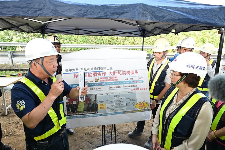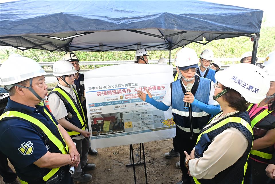 新聞焦點 提升中彰通行便利性 視察「臺中大肚-彰化和美跨河橋梁工程」 發布日期 2026/04/20~2026/05/20 | 發佈單位: 工務處 | 發佈日期: 林代理科長 7532093 | 更新日期 2026/04/20 | 瀏覽人數: 117人 《置頂》 彰化縣長王惠美於今(20)日上午在縣府主管同仁陪同下,與臺中市政府、多位議員共同前往和美鎮「臺中大肚-彰化和美跨河橋梁工程」工地,視察施工進度並聽取簡報。王縣長表示,本工程計畫經費約32億元,因橋梁橫跨中彰兩縣市之行政區域,經協議各負擔50%經費約16億元,縣府獲交通部公路局補助約12.17億元,在議長謝典霖及所有議員對預算的支持下,縣府自籌約3.83億元。工程由臺中市政府代辦,自112年1月31日開工,預計115年10月底開放通車。 王縣長表示,從擔任立委時期就積極推動這項工程,本工程自臺中大肚南接彰化和美,全長約1,690公尺,其中主橋長達1,440公尺,橋寬22公尺,設有雙向4車道、2機車道及人行與自行車的共用道。工程自開工以來,進度持續超前,整體進度已近89%。感謝臺中市承攬施工重任,肯定施工團隊效率並兼顧工安,期盼儘速竣工並順利通車。 王縣長指出,完工後不僅能大幅提升臺中與彰化之間的交通功能,並串聯國道1號、國道3號、台74環狀線以及台61線,能有效紓解大度橋和中彰大橋的壅塞情形,也能落實「中彰30分鐘生活圈」目標。往來彰化臺中通行橋梁最快僅需2分鐘,大幅縮短通行時間。 和美鎮長林庚壬表示,感謝臺中市政府及彰化縣政府共同打造大肚和美橋,讓交通變得更通暢快速。 臺中市政府建設局總工程司陳建權表示,目前工程朝既定期程穩定超前,預計今年10月底通車,原本大肚到和美30分鐘,未來2分鐘就可到達,地方經濟與交通日後會更加發展。感謝王縣長,以及中央包括內政部、交通部的補助,更感謝台中市盧市長的用心,完成20年來地方的期待。 工務處表示,本計畫自臺中大肚端文昌路二段出發,跨越烏溪,南接彰化和美,銜接省道台61乙線,有效紓解大度橋及中彰大橋交通壅塞。本次視察集合於「國道三號橋下晉北路486巷路口」,原規劃增設中央分隔島並封閉既有村里聯絡道,經民眾反映後,縣府邀集相關單位研議,保留原路口通行功能。未來將視車流量及交通狀況,由管理單位再行評估是否封閉或增設分隔島。縣府將持續完善交通路網,帶動區域發展,打造彰化成為宜居宜遊的「美好彰化 希望城市」。 與會貴賓有縣議員林小琪、周君綾、賴清美、柯振杯、蕭文雄、和美鎮長林庚壬、和美鎮民代表會主席周保方、臺中市政府建設局總工程司陳建權、縣府參議柯呈枋、新聞處長李俊德、各級民意代表與地方仕紳等。