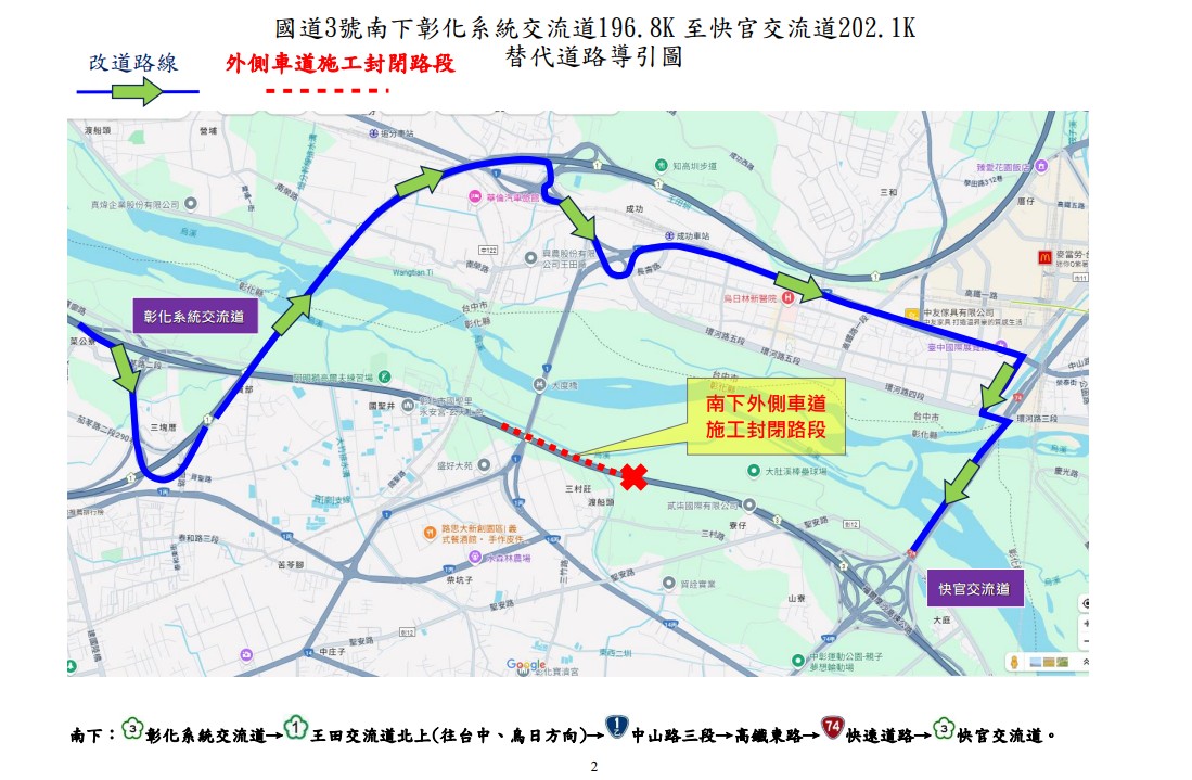 新聞焦點 國道3號南向彰化系統交流道至快官交流道路段(198.6k-200.5k)橋面整修作業施工因故延至114年8月19~22日辦理說明 歷史訊息 | 發布日期 2025/08/19~2025/09/19 | 發佈單位: 工務處 | 發佈日期: 洪科長 7532131 | 更新日期 2025/08/19 | 瀏覽人數: 11人 一、本分局前為維護國道行車安全,原訂本週辦理國道3號南向彰化系統交流道至快官交流道路段(198.6k-200.5k)橋面整修作業施工,因颱風影響延後至114年8月19日至114年8月22日辦理,預訂於114年8月19日(星期二)9時起封閉南向198k+600至200k+500第3車道及外路肩施工,並預計於114年8月22日(星期五)12時前完成施工,倘提早完成,將隨即開放通車,施工期間影響車流,請用路人配合依標誌指示行駛或提前改道。 二、施工期間行經該路段用路人,可利用下列改道路線,避開壅塞路段。 於彰化系統交流道南下出口匝道駛離國道3號接→國道1號王田交流道北上入口匝道(往台中、烏日方向)→台1乙線(中山路三段)→右轉接高鐵東路→台74線快速道路→續接國道3號快官交流道往南行駛。 三、請用路人行經交通管制區域減速慢行,並依既有指示牌面及工程施工單位所設導引牌面說明行駛,遵守管制人員導引,以確保行車安全,造成不便,尚請見諒與配合。 四、請用路人隨時注意本路段資訊可變標誌顯示訊息,亦可撥打1968(路況查詢專線)及收聽警察廣播電台,或上高速公路局全球資訊網www.freeway.gov.tw以瞭解最新施工路況。 五、聯絡方式: 施工單位:蘭陽營造有限公司 工地負責人:郭梅娟 電話/行動電話:0953-170770 監造單位:集緻工程顧問股份有限公司斗南監造工務所 監造人員:洪瑋皓 電話/行動電話:0978-305021 督工單位:高速公路局中區養護工程分局斗南工務段 段長:馬信宏 電話/行動電話:0933-558973